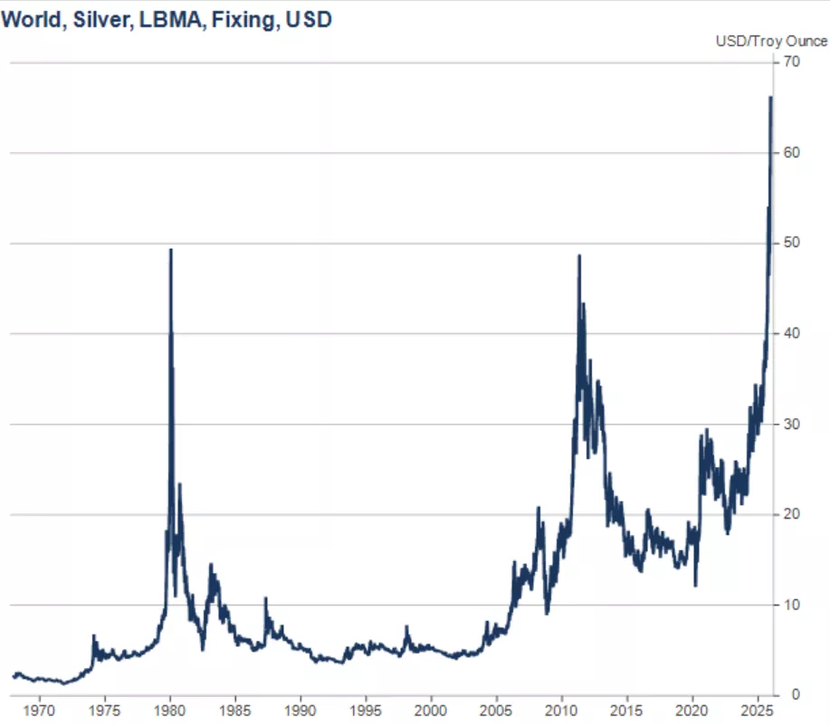 当时,芝加哥商品交易所(CME)在九天内连续五次上调白银保证金要求。这一举措迫使期货市场大规模去杠杆,导致白银价格在几周内暴跌近30%。虽然实物需求并未消失,但杠杆资金的撤退足以摧毁价格。随后,随着QE2结束和实际利率回升,白银进入了漫长的熊市。