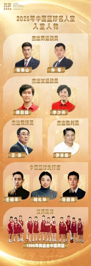 在2025年中国篮球名人堂入堂名单中,前男篮国手张锡山、孙军,前女篮国手周懿娴、李少芬,知名教练王非等人榜上有名,1996年奥运会中国男篮队伍作为优秀集体同样入选名单。值得一提的是,李少芬是钟南山的妻子。