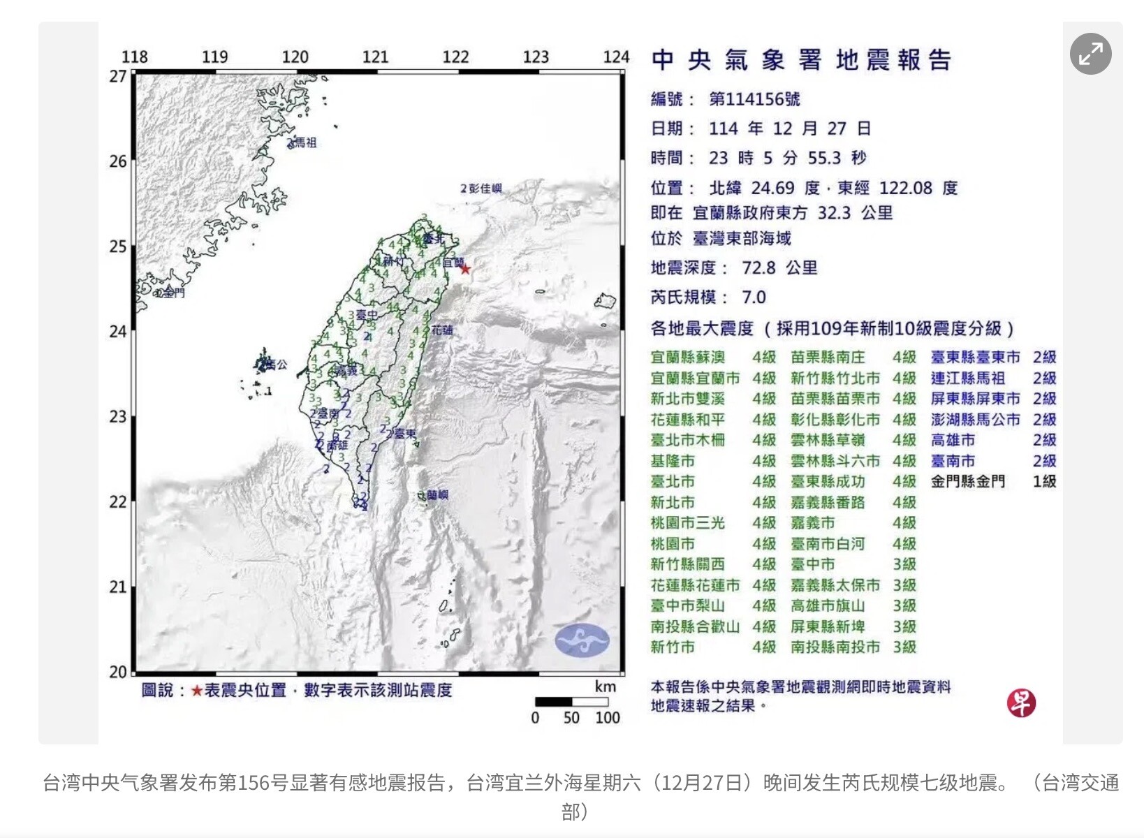 台湾宜兰外海星期六(12月27日)晚间发生7.0级地震,全台多地出现强烈震感,台北一些高楼发生摇晃。