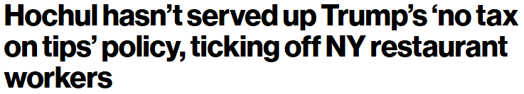 “这些‘吝啬鬼’对一个显而易见的好政策却拒绝执行。”纽约州州长凯西·霍楚尔以及民主党籍纽约州议员尚未将总统川普提出的“对小费免税”政策延伸至州所得税层面,在高喊“可负担性”的同时,却实实在在地让酒吧招待和餐饮从业者的钱包受损。