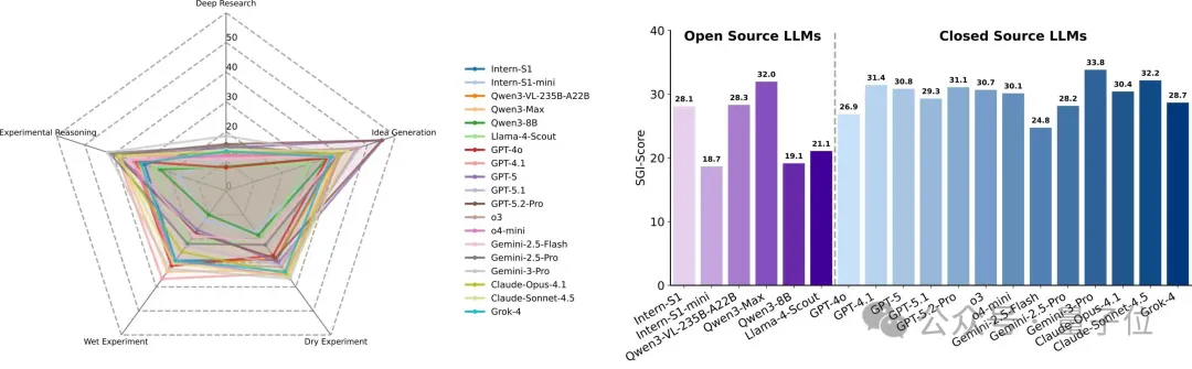 团队将上述四维能力的综合定义为SGI,并发布覆盖全流程的SGI‑Bench。首轮结果:闭源模型Gemini‑3‑Pro以SGI‑Score 33.83/100取得SOTA,但距离“会做研究”的门槛仍显著不足。