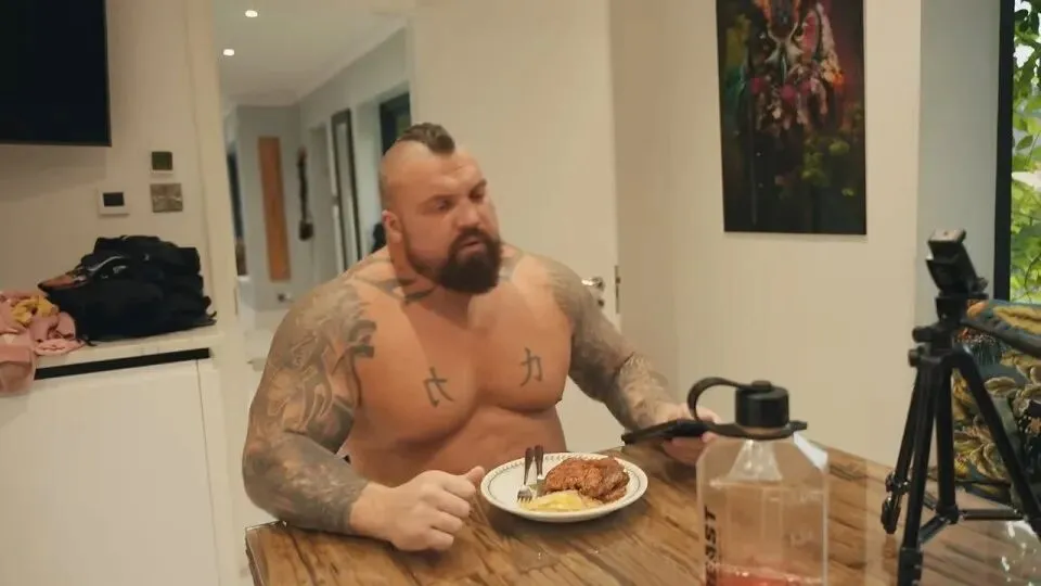 2016年,埃迪为了成为“世界最强壮男人”,每天把命挂在杠铃上。最疯狂的时候,1米88的他体重达到203公斤,每天吞下的食物热量高达12500卡路里——快相当于7个成年男性一天的总饭量。
