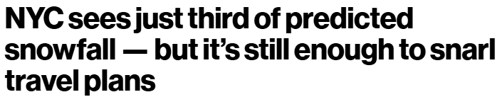嗯,这场降雪确实令人失望。“大苹果城”此次仅迎来了此前预期的“冬日仙境般”降雪量的三分之一,但降水量仍然足以打乱很多旅客的假期出行计划。