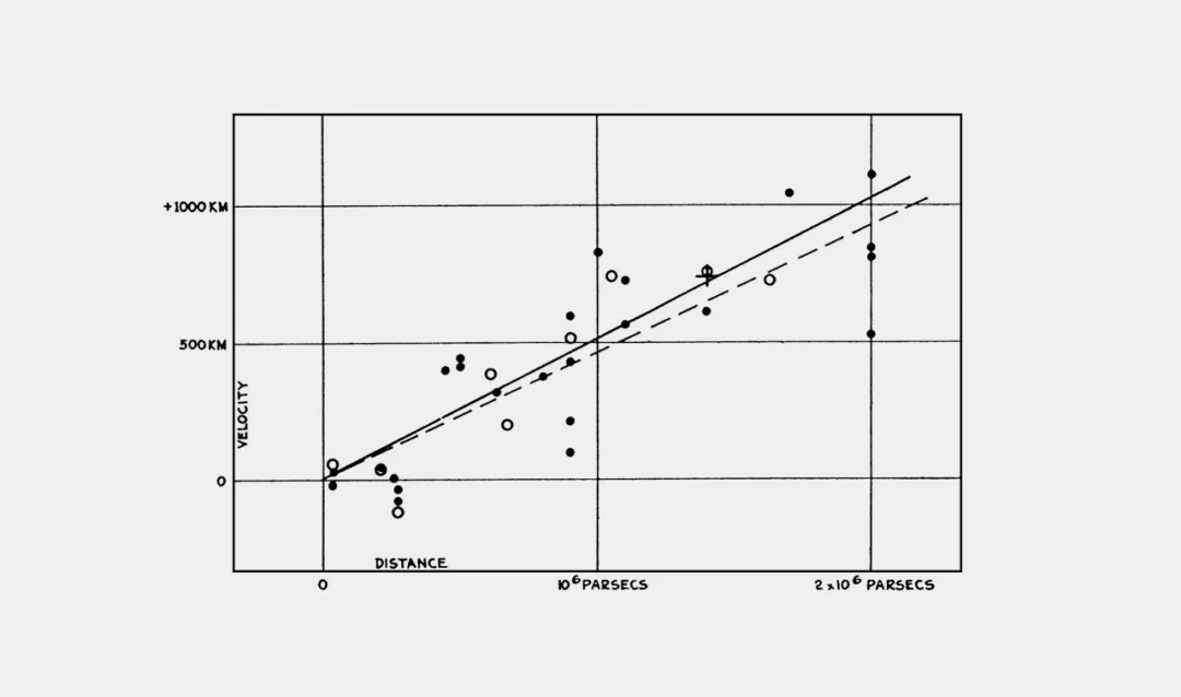 在论文中,哈勃绘制了星系的速度和距离的关系图,结果显示二者呈现出了线性的关系:距离我们越远的星系,远离我们的速度越快。