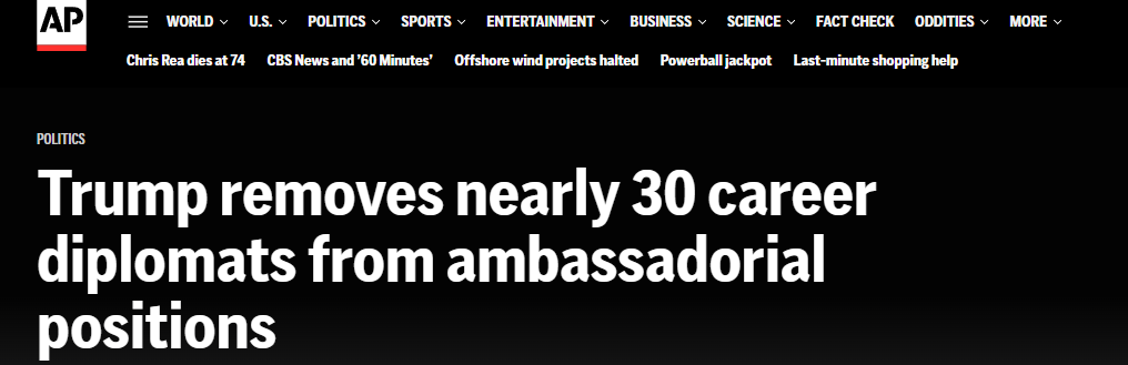川普政府正在召回近30名职业外交官,涉及大使及其他高级使馆职位。此举旨在重塑美国的海外外交姿态,确保关键职位由完全支持总统川普“美国优先(America First)”议程的人员担任。
