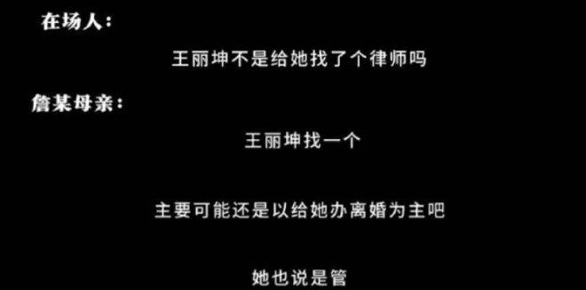对方还提起了王丽坤,说王丽坤给詹某请了律师,但詹母透露王丽坤请律师可能主要是办离婚为主。后面詹母疑似是在说她有联系上王丽坤,王丽坤疑似还答应她会去看看詹某。