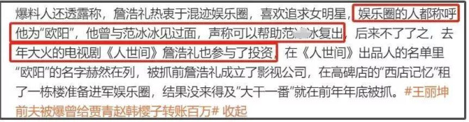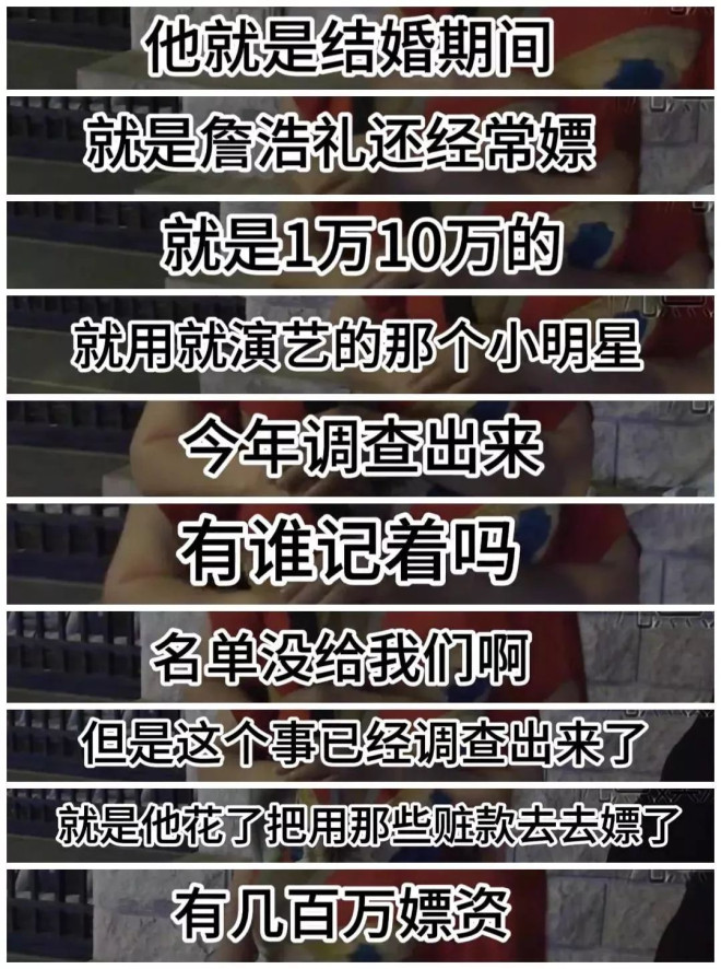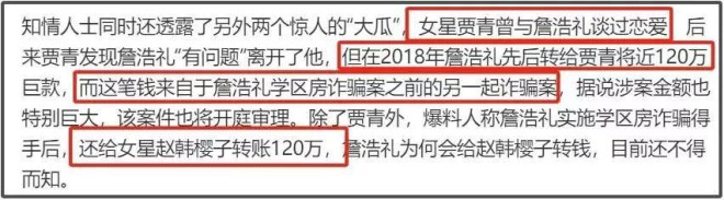 詹浩礼跟娱乐圈牵扯很深,投资过大爆剧《人世间》,和贾青交往,还被曝给赵樱子转了120万。当然,后来赵樱子否认了。而受害者还曝出了很多细节,包括詹浩礼与王丽坤结婚之后,照样出去嫖娼,对象都是演艺圈的小明星,直接有一份名单,都调查出来了。