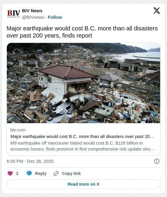 该报告由B.C.灾害与气候风险及韧性评估(DCRRA)发布,并警示此次地震有可能导致加拿大财产与意外保险行业崩溃,同时使B.C.的经济增长减半。