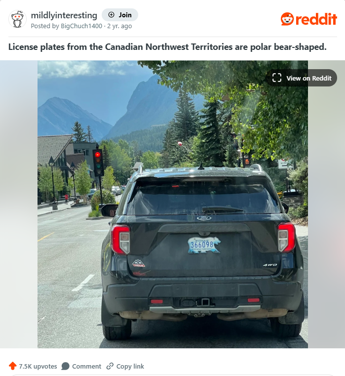 努纳武特在1999年独立为单独地区时,北极熊车牌版权仍属N.W.T.,但两地最终都保留了设计。2012年,努纳武特改为矩形车牌,上面印有北极光下的彩色北极熊。今年,努纳武特又推出了自己的独特北极熊车牌,新版北极熊面向左侧,而N.W.T.版则向右。