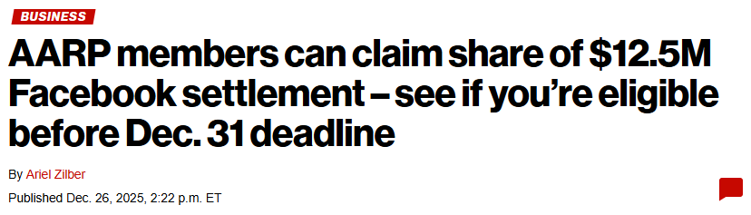 要获得赔偿,索赔人必须满足四项条件:在2020年9月27日至2025年9月12日期间,在AARP.org观看视频内容;当时身处美国;拥有一个活跃的Facebook账户;同时是AARP会员或AARP.org注册用户。