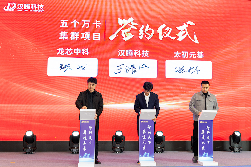 同时,汉腾科技与龙芯中科、太初元碁完成“五大万卡集群项目”签约。根据协议,龙芯中科、太初元碁将为汉腾科技提供核心处理器及自研高性能AI加速卡,并协同完成计算、网络、存储、供电系统集成,助力其算力基础设施建设顺利落地。相关成果将应用于汉腾科技在石家庄、承德、兴化等多地布局的智算中心,形成覆盖华北、华东的算力服务网络,为人工智能产业发展与各行业智能化转型提供自主可控、高效稳定的算力保障。