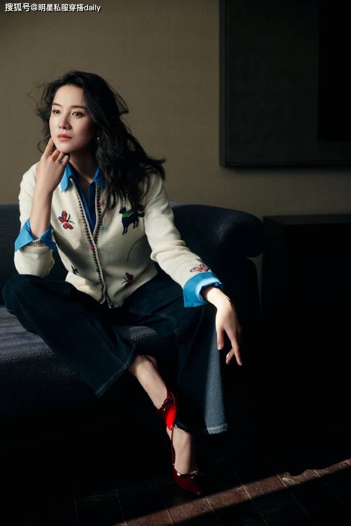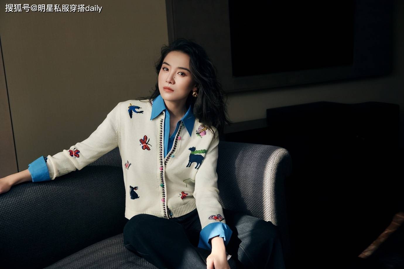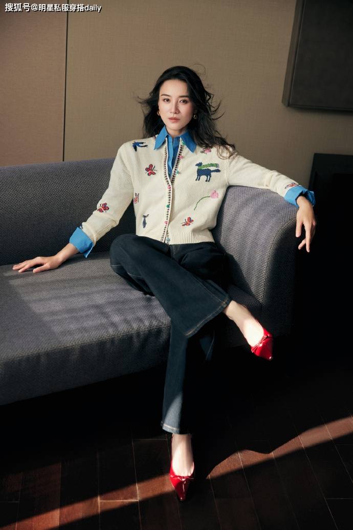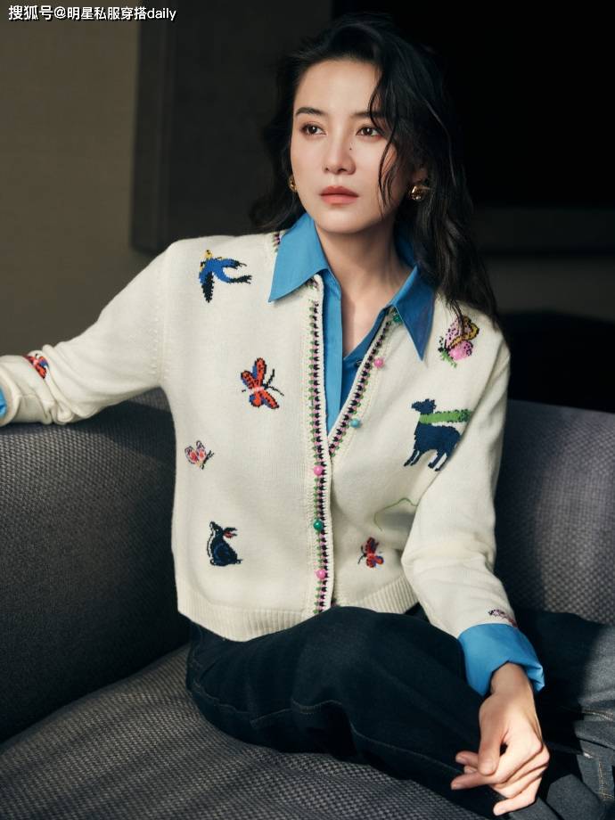 秋冬穿搭也需要一点色彩感!不是非要穿的大红大绿才是色彩感,也可以穿一些亮眼的蓝色,比如宋佳,身穿一件蓝色衬衫,外搭一件刺绣米白色针织开衫,层次感和时尚感兼具。