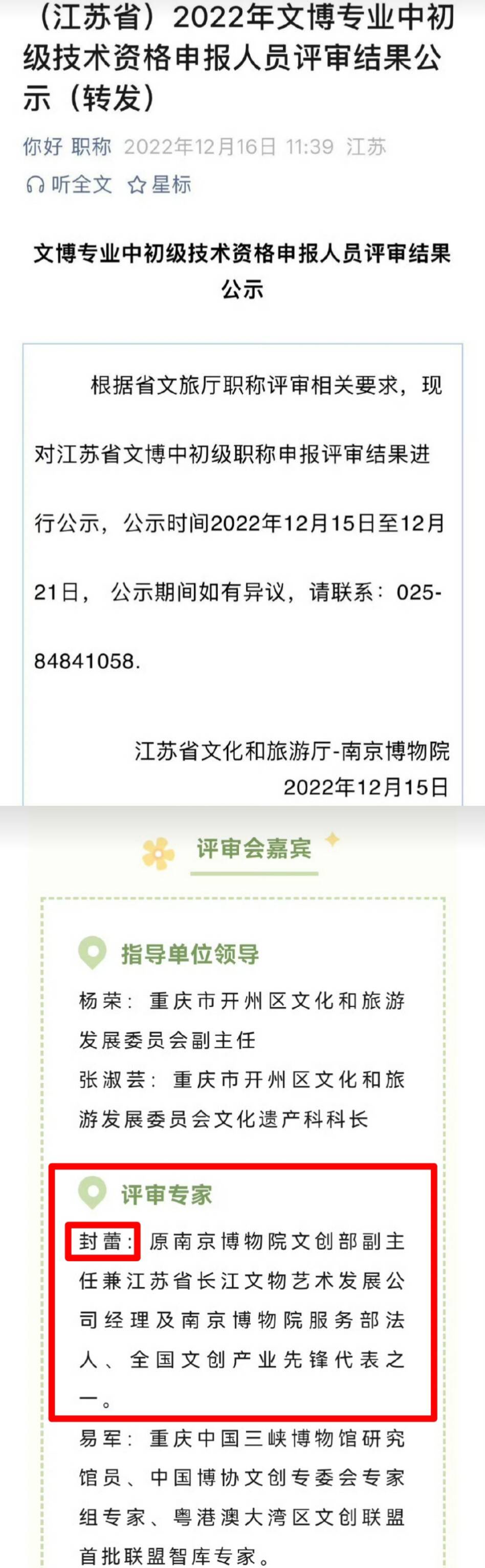 本来没有什么大问题,公司人物变更时常有事情,但是亚洲周刊发现,封蕾这个名字在2022出现在了江苏省的文博专业申报人员的评审结果公示里。