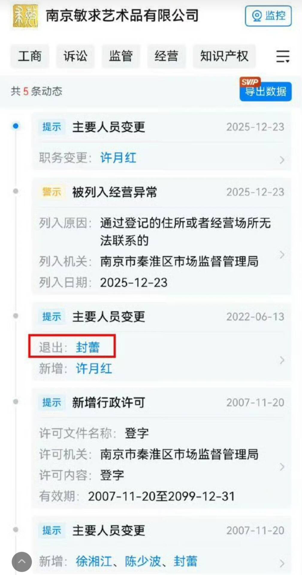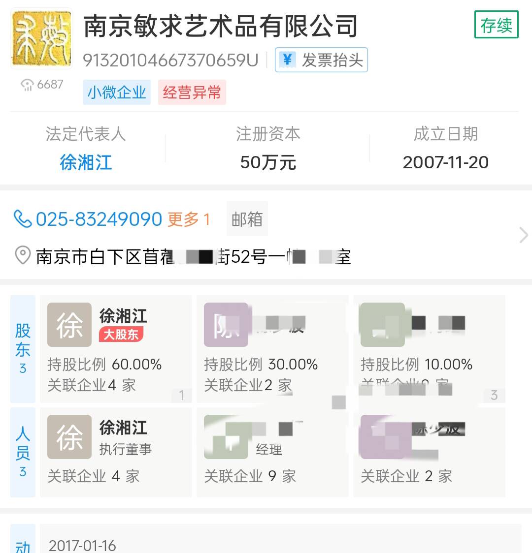 没想到,徐湖平刚被带走调查没多久,大家就发现了他的儿子徐湘江旗下的“南京敏求艺术品有限公司”,就已经被列入经济异常。