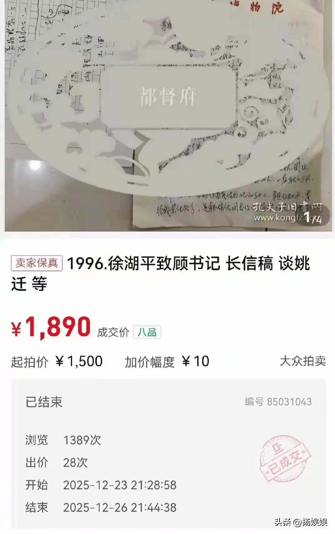 搅动风云的主角,竟然是一封老掉牙的书信。在孔夫子拍卖网被挂出来,起拍1500,最后成交1890块。落款徐湖平,收信人顾姓领导。