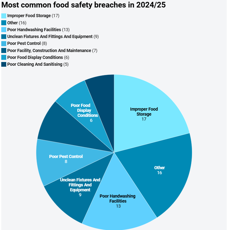 悉尼市议会的发言人表示,今年最常见的违规行为包括:缺乏食品防污染措施、食物接触表面不干净,以及洗手设施缺乏热水、肥皂或一次性毛巾。
