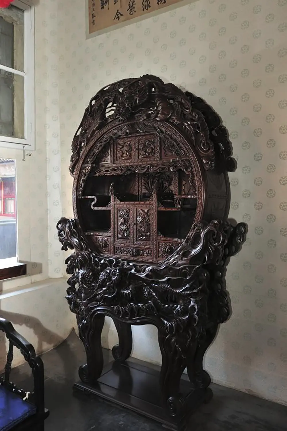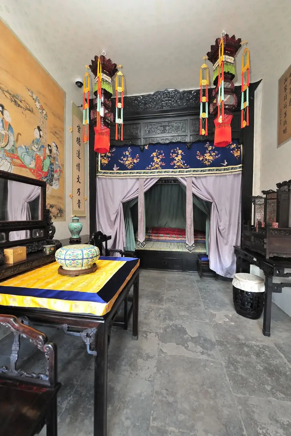 长春宫明间为礼仪性空间,设地坪宝座一套,东西次间为后妃居住、读书的起居空间陈列,设有床榻、椅杌、案几、柜格、宫灯及陶瓷、珐琅、玉器等陈设用品;东西梢间为寝室,寝床前悬挂幔帐,屋内陈设有桌案、绣墩、盆架等家具,案上设妆奁匣、插屏镜等生活用具。