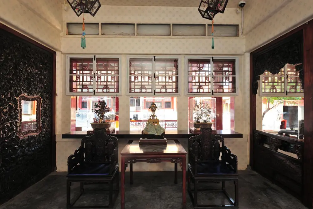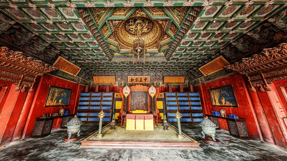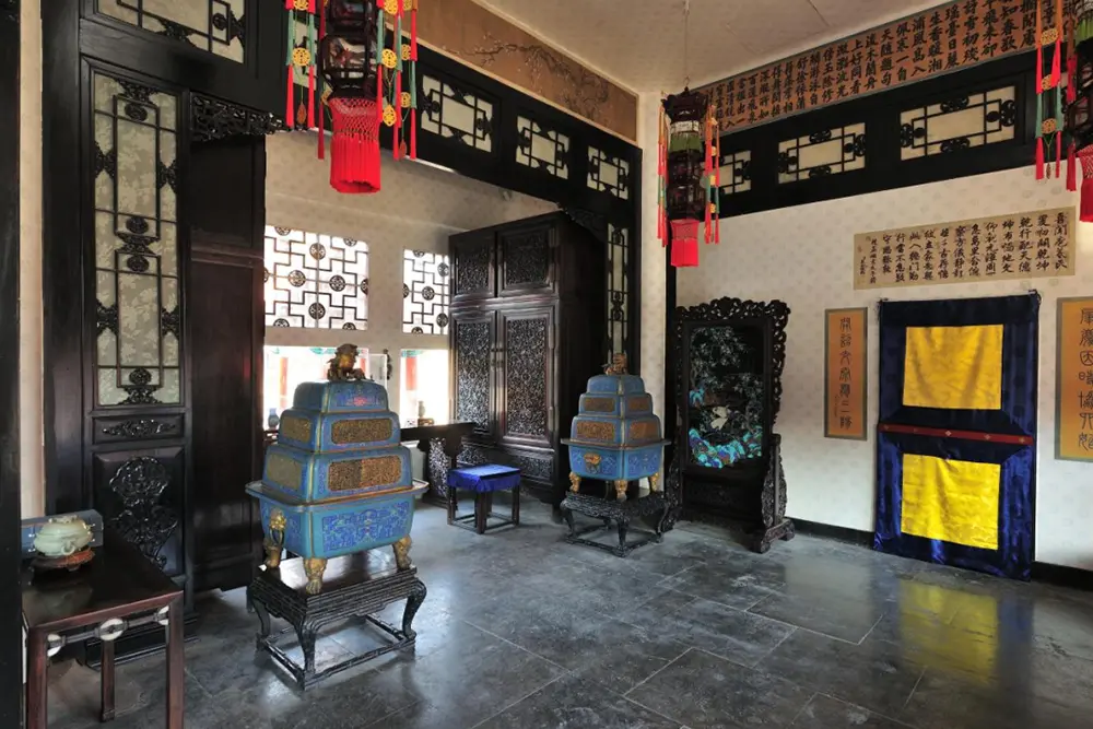 体元殿明间作为穿堂对观众开放;东西次间、东梢间按照后妃生活空间布置,几案上有盆景、钟表等陈设;西梢间曾作为佛堂使用,陈列有佛像及供器等。
