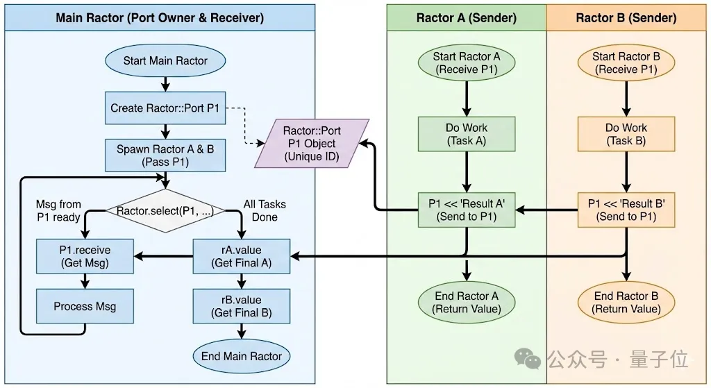 而在新版设计中,Ractor::Port充当了专用信道的角色,任何人都可以向这个端口发送消息,但只有端口的创建者才有权从里面取出消息。这种“多对一”的单向通道设计,完美契合了Actor模型的语义。
