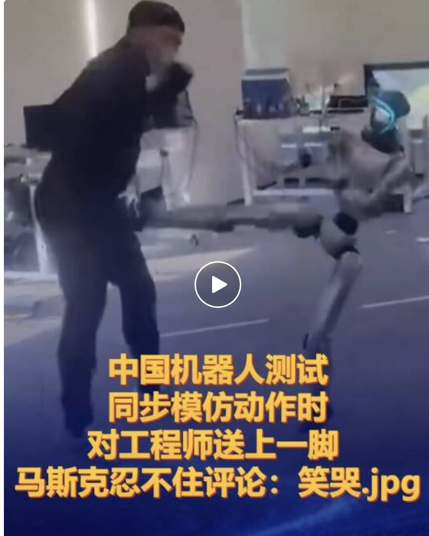 当地时间12月27日,特斯拉Cybertruck首席工程师在社交媒体转发了一段中国宇树G1机器人进行模拟动作测试的画面。G1机器人与工程师同步进行战斗动作,然而接下来的一幕让人忍俊不禁,机器人在模仿动作时对工程师送上“恶毒”一脚。