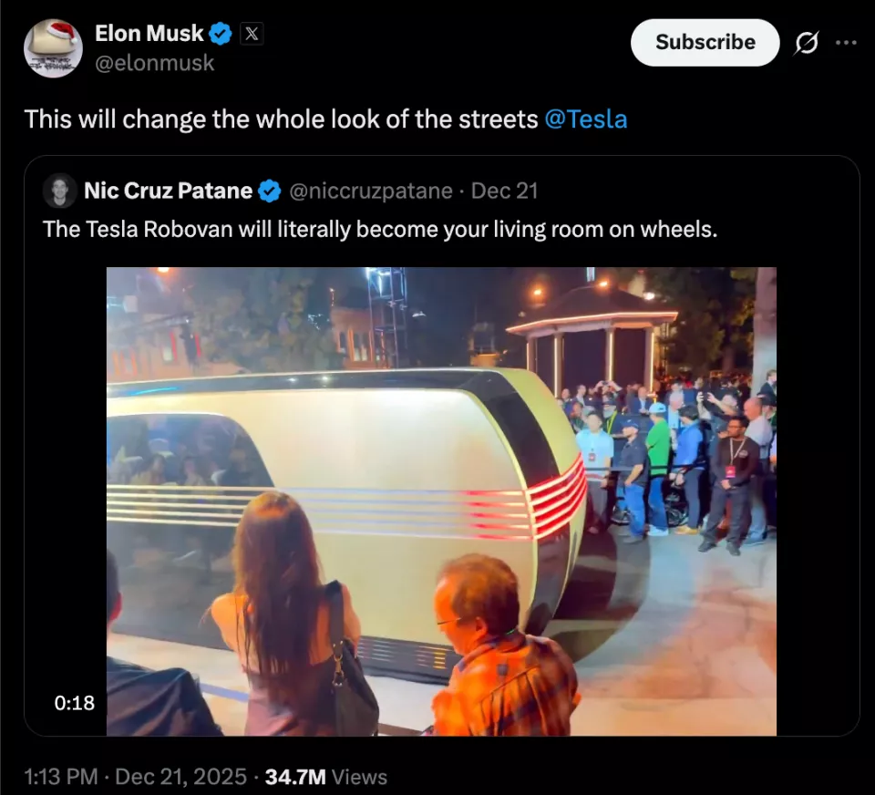 马斯克表示,Robovan 的运营成本可降至每英里 5 至 10 美分,远低于传统公共交通。