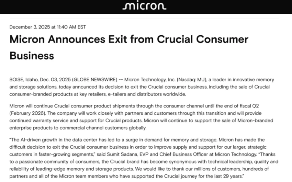 12月,美光宣布,决定退出Crucial(英睿达)消费级业务,包括在全球主要零售商、电商平台和分销商处销售英睿达消费品牌产品。美光方面表示,将通过消费渠道继续供应英睿达消费级产品,直至明年2月。