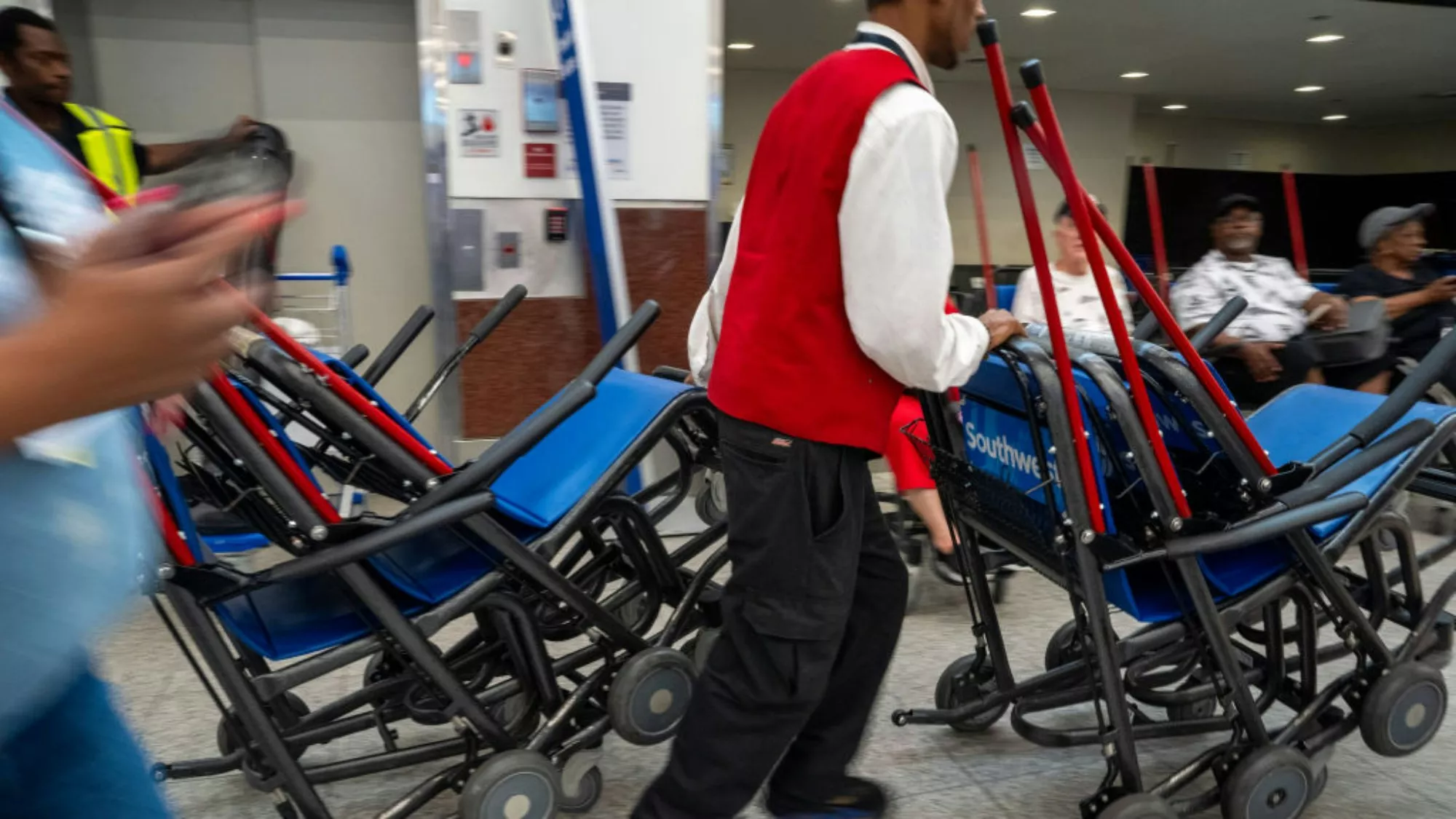 2024年6月28日,佐治亚州亚特兰大,一名工作人员在哈兹菲尔德-杰克逊亚特兰大国际机场推着数辆轮椅。(Getty/示意图)