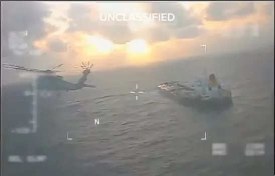 2025年12月20日,美国土安全部长诺姆(Kristi Noem)在社交平台上传一条美国执法部队在国际海域扣留油轮的视频,诺姆指控油轮运输石油,并通过获利用以资助委内瑞拉非法行动。(截图自X@Sec_Noem)