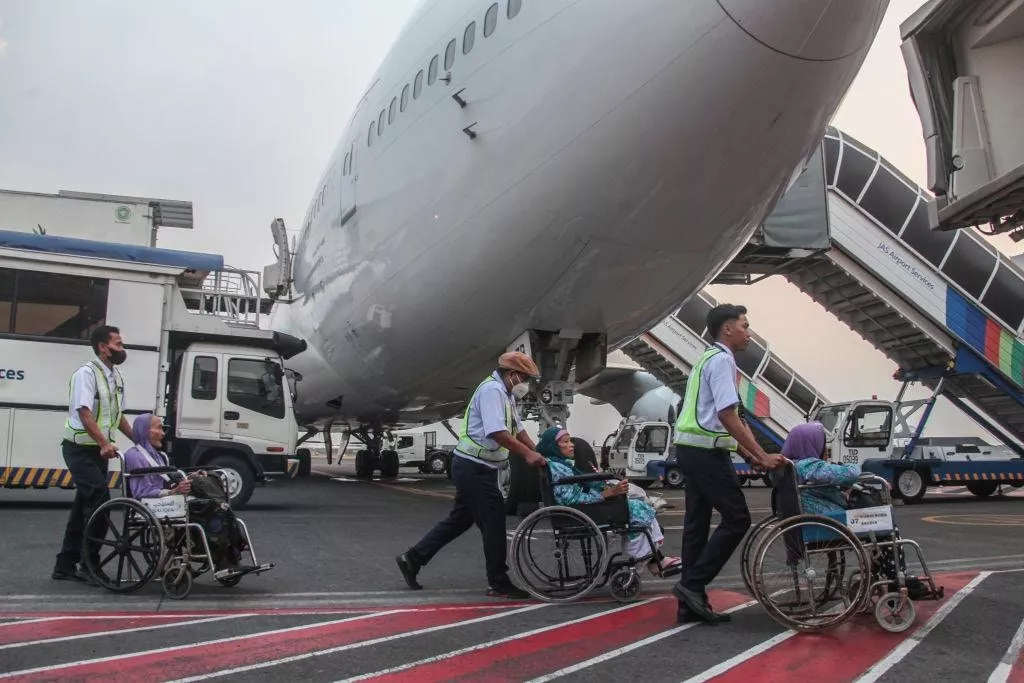 穆斯林朝圣者于2023年7月4日抵达印尼朱安达国际机场(Juanda International Airport),有机场人员推着坐轮椅的乘客。(Getty)