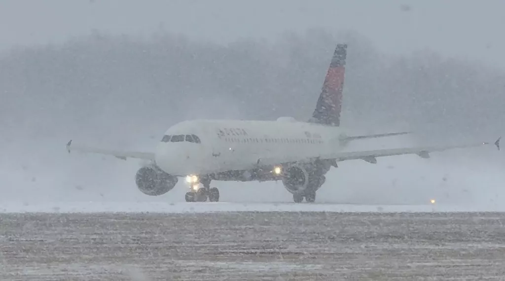 暴风雪在圣诞假期席卷美国东部。画面为达美航空班机26日在暴风雪中从大罗彻斯特国际机场起飞。(路透)