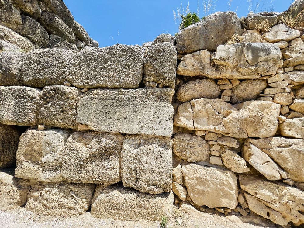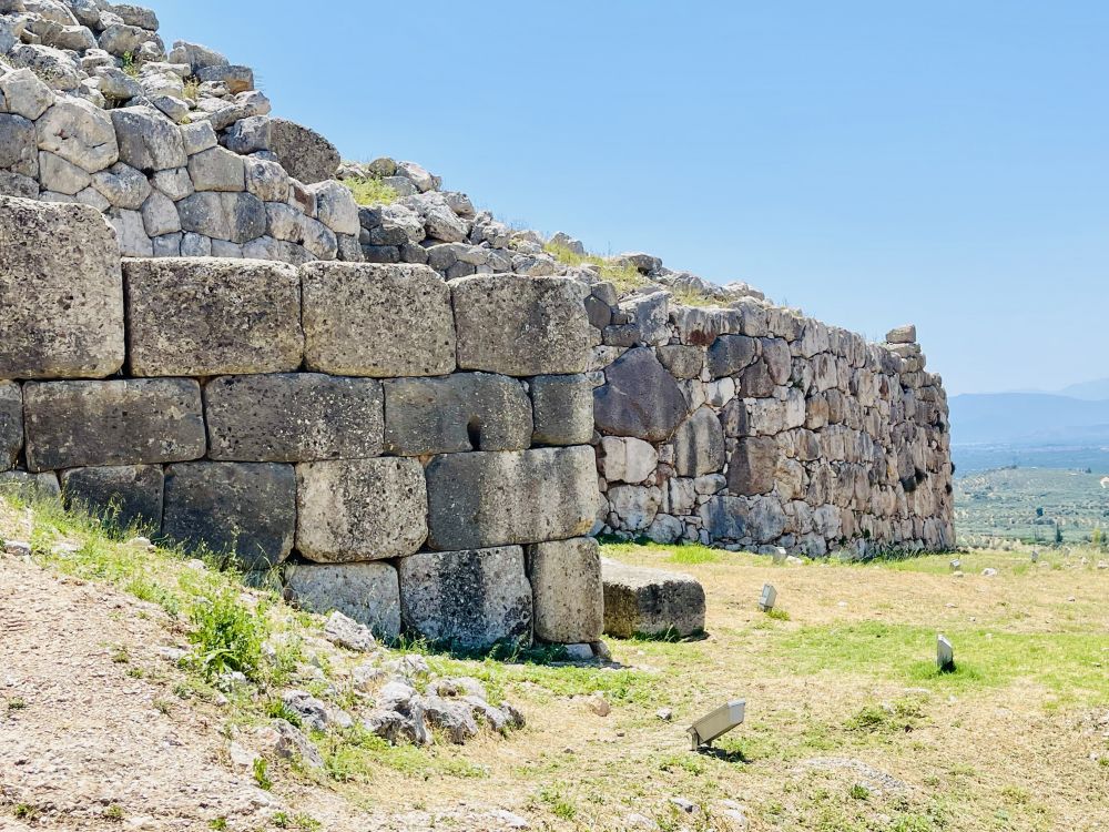 迈锡尼卫城以巨石城墙(Cyclopean Walls) 著称,整座城被一条长约900米的城墙围住。在古希腊神话里,传说巨大的石块是帕尔修斯请来了独眼巨人Cyclopes为他建造的。组成城墙的这些粗糙巨石,一块块被垒叠起来,而且其间并未用任何黏合材料。城墙的平均厚度达6米,最厚处甚至高达8米至10米,最大单块石块重量超过100吨。它依山形而建,时起时伏。