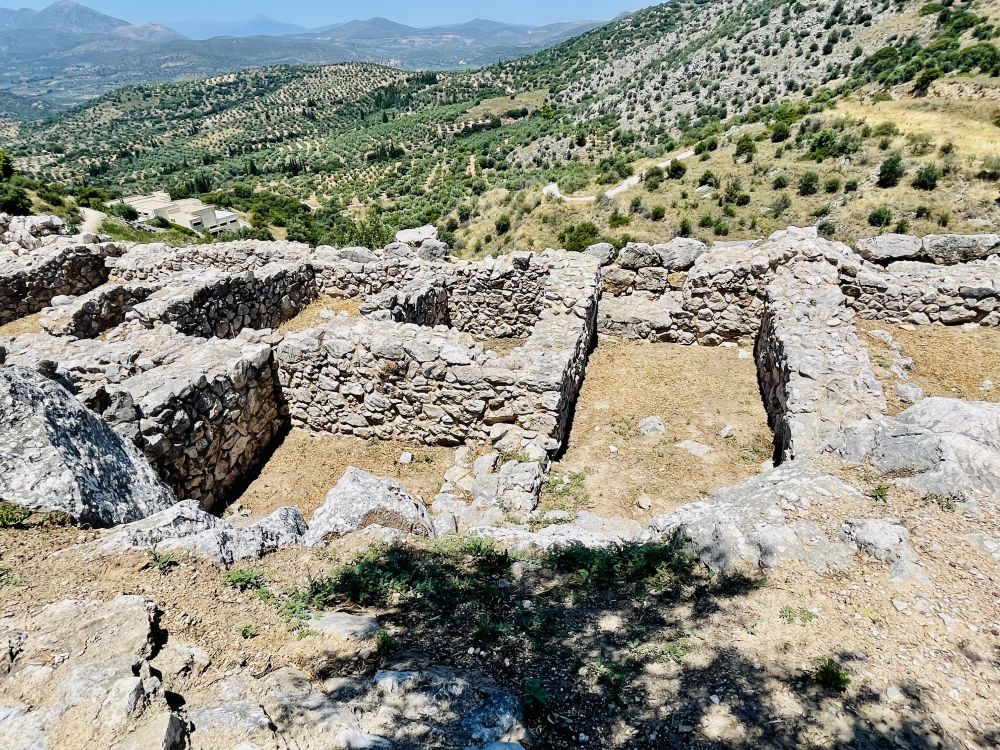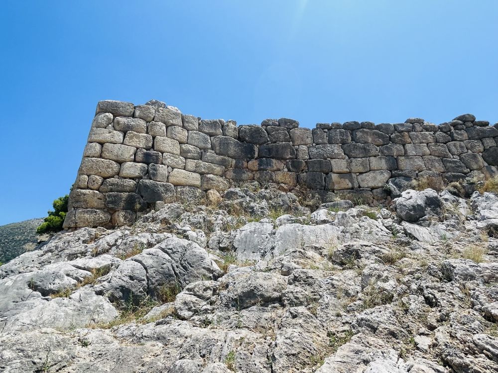 卫城残存的遗迹只剩下纵横的墙基裸露在地面上,规模大些的是公共建筑,大大小小的遗迹散落在山坡上,山顶巨岩是王宫遗迹,站在山巅远眺周边群山,昔日辉煌只能全凭想象。