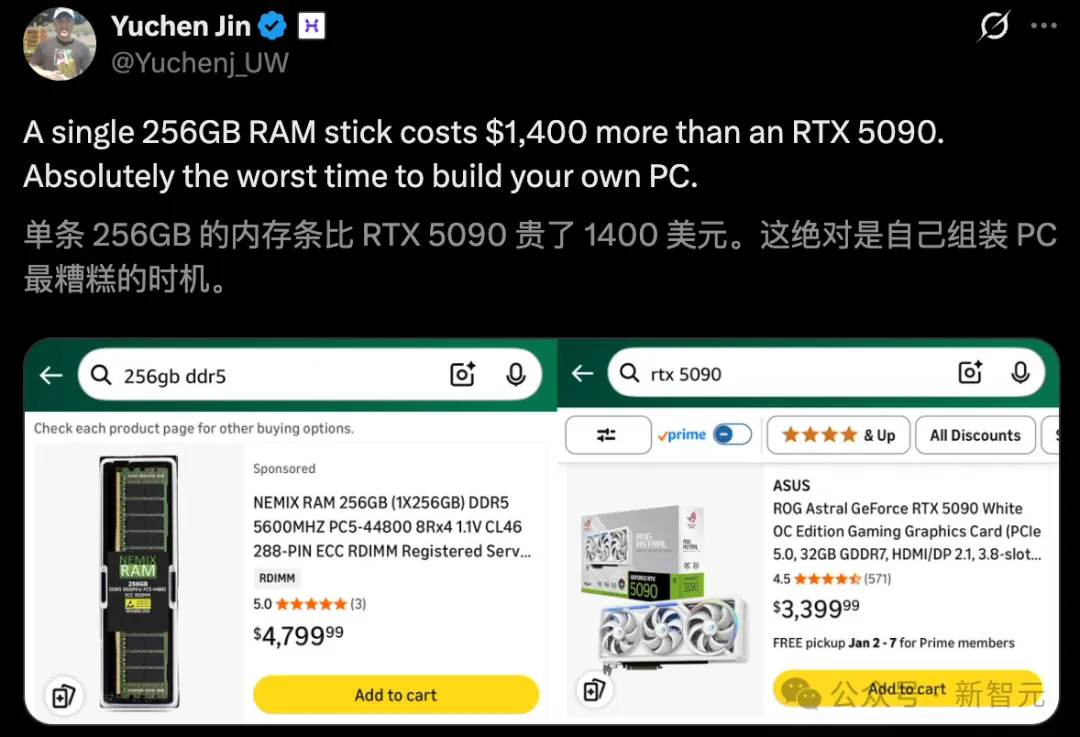 还有人发现,一根256G内存条要比一张RTX5090,还要贵出1400美金。