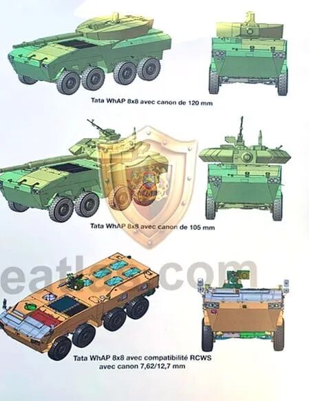 WhAP 8×8采用任务模块化设计,其可能的变型车包括:装甲运兵车,可搭载包括驾驶员在内的三名车组人员和最多八名步兵;配备30毫米自动炮和同轴机枪的步兵战车;配备105毫米或120毫米火炮的轻型坦克或机动火炮系统;120毫米迫击炮载车;指挥控制车;核生化侦察车以及装甲救护车。在印度国内展示的版本多配备基于 BMP-2的30毫米炮塔或TASL设计和开发的遥控武器站(RCWS),带有热瞄准具和由DRDO国防冶金研究实验室开发的外部附加装甲,配备7.62毫米/12.7毫米机枪。