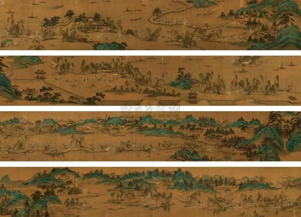 其中,唐代有阎立本《锁谏图卷》、韩幹《呈马图卷》、王维《春溪捕鱼图卷》、周昉《村姬擘阮图轴》;五代有赵驸马《神骏图卷》、董源《夏山图卷》、张戡《人马图轴》、巨然《流水松风图》;宋代有宋徽宗《雪江归棹图卷》、赵子固《水仙图卷》、钱选《浮玉山居图卷》、李嵩《西湖图卷》;元代有赵孟頫《秀石疏林图卷》、黄公望《富春大岭图》、倪瓒《渔庄秋露图轴》、王蒙《青卞隐居图》、王冕《墨梅图轴》等。