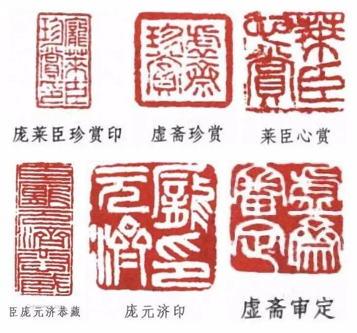 作为收藏大家,庞元济的收藏鉴赏印鉴众多,所见有:“庞元济印”、“虚斋审定”、“虚斋珍赏”、“莱臣心赏”、“庞莱臣珍赏印”、“臣庞元济恭藏”等,这些都由著名篆刻家赵叔孺、王大炘、胡钁、吴昌硕、汤临泽为其刻印。