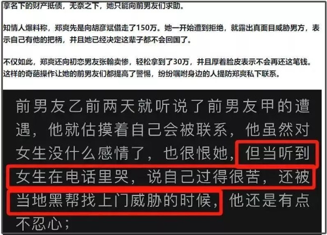 接下来,就是一系列有关郑爽美国生活窘境的爆料,兜里有钱被人盯上了,想通过交往白人男友融入美国失败了,生活困顿想方设法和明星前男友要钱了……