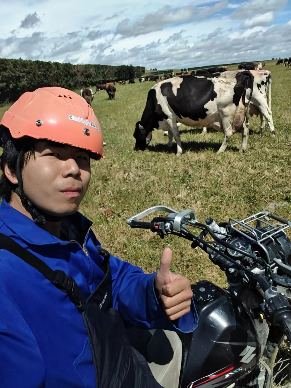 新西兰牧场工作现场,何赛正在进行挤奶和除草。受访者供图。