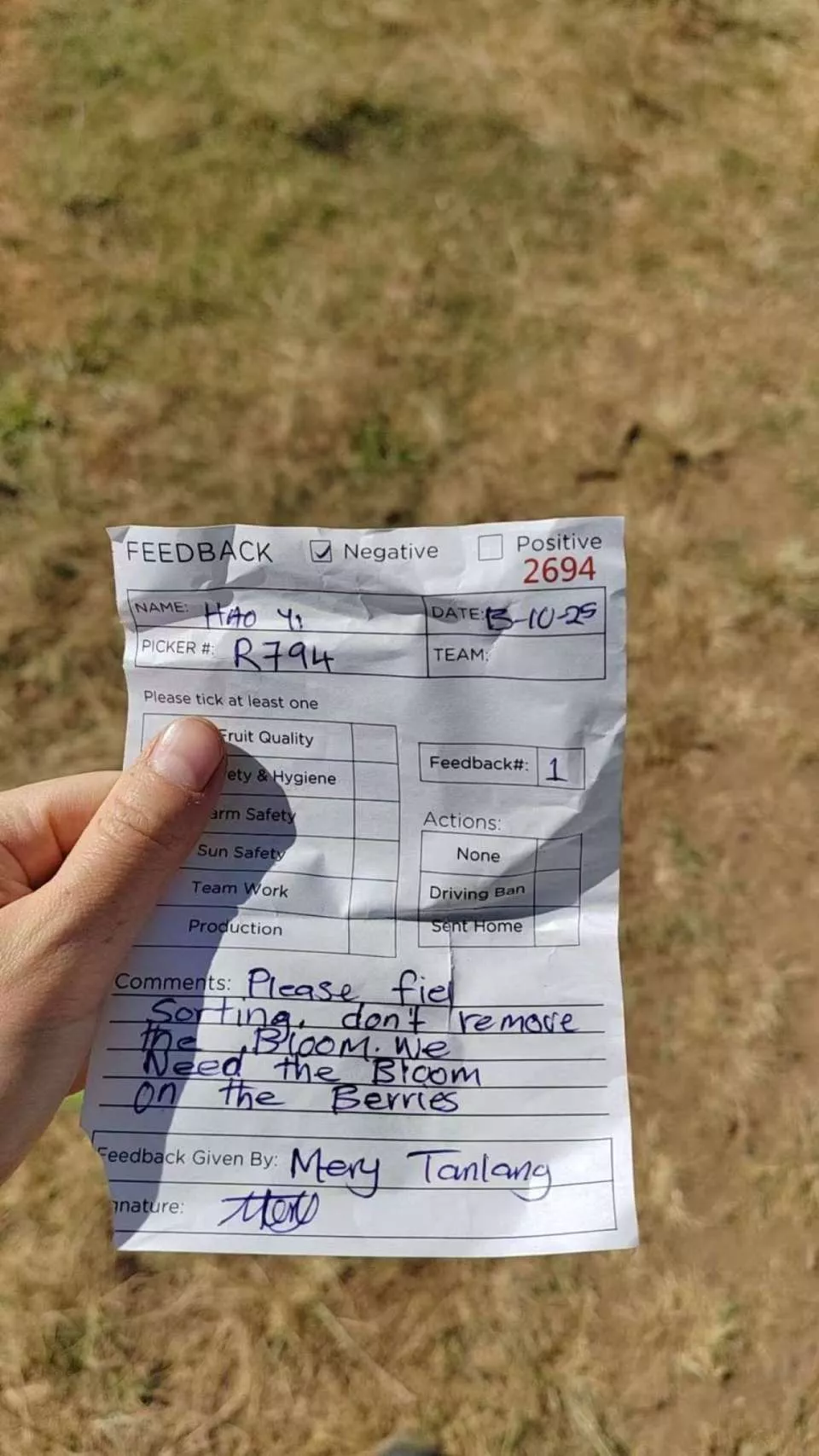 陆皓月被解雇当天收到的“蓝山”蓝莓农场罚单,罚单理由为蓝莓采摘质量不合格(过软,too soft)。受访者供图。