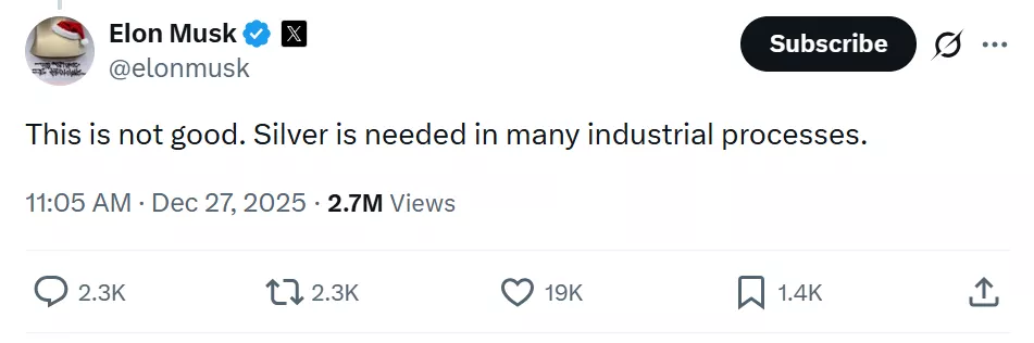 马斯克在社交媒体平台X上发表上述言论的。针对关于白银价格因“严重的全球供应短缺”而出现爆炸式增长的讨论,马斯克评论称: