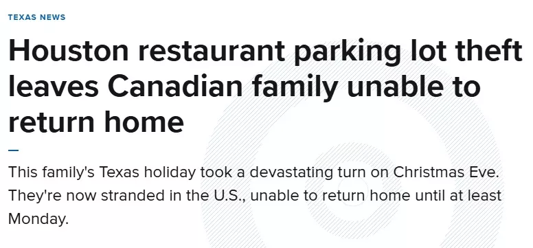 据KVUE报道,一户来自加拿大的家庭在美国德州休斯敦度假期间遭遇砸车盗窃,几乎所有随身物品被盗,包括一家四口的护照,导致他们被迫滞留美国,无法按原计划返程。