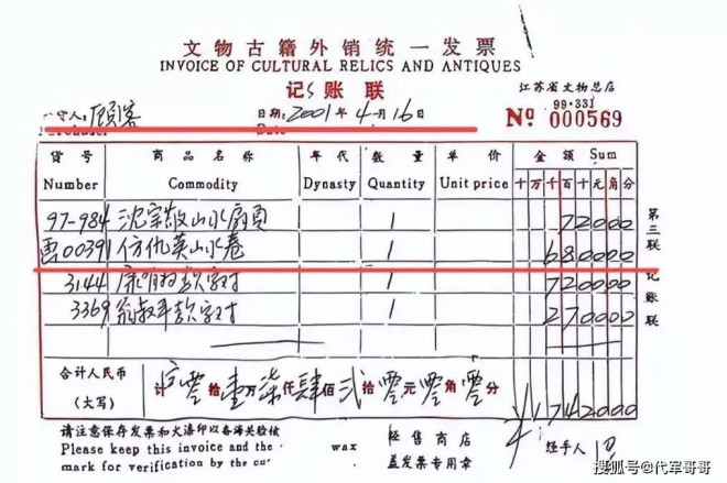 顺着这条线索,庞叔令展开了深入的调查。她发现,南京博物院对于这幅争议画作的说法与拍卖市场上的情况存在着巨大的差异。南京博物院声称,这幅画作以及其他几件争议文物在 1961 年、1964 年经两轮专家鉴定被认定为 “伪作”,因此,在上世纪 90 年代,依据《博物馆藏品管理办法》,这些文物被调拨给了原江苏省文物总店。到了 2001 年,这幅画又被以 6800 元的价格售出,销售清单上标注为《仿仇英山水卷》。