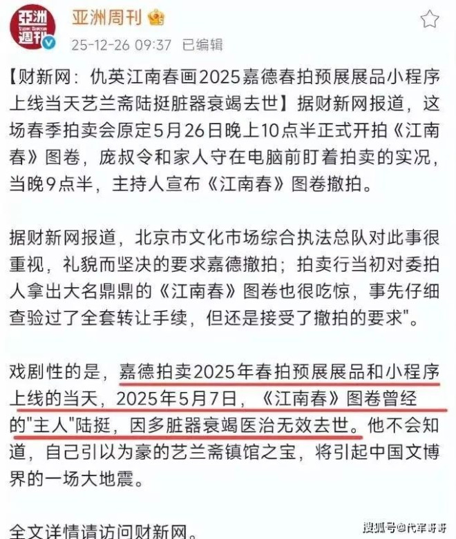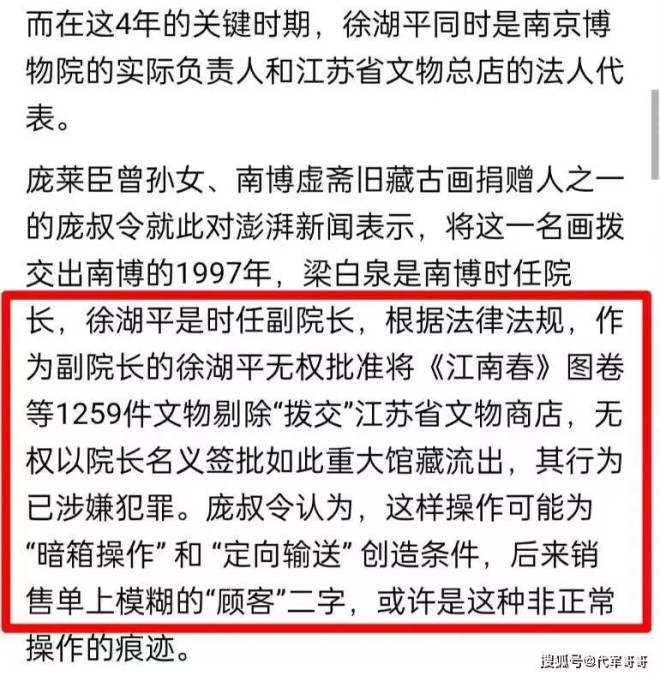 其次,徐湖平作为南京博物院的前院长,同时也是这幅画拍卖时的 “掌眼” 人,他的身份和行为更是引发了人们对利益输送的质疑。在文物鉴定和交易领域,“掌眼” 通常意味着对文物的真伪和价值进行专业的判断和评估,具有很高的权威性。然而,在这起事件中,徐湖平的 “掌眼” 行为却让人感到十分蹊跷。他一方面作为南京博物院的管理者,参与了文物的鉴定和调拨工作,另一方面又在自己儿子的拍卖行中为这幅画进行 “掌眼”,这两者之间的关联实在是太过紧密,很难不让人怀疑他是否利用自己的职权和专业地位,为自己和家人谋取私利。