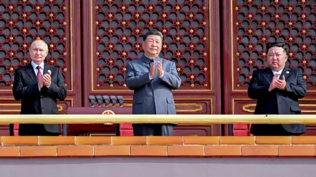 普京(左)、习近平(中)、金正恩(右)同台亮相“九三阅兵”,引起国际社会关注。