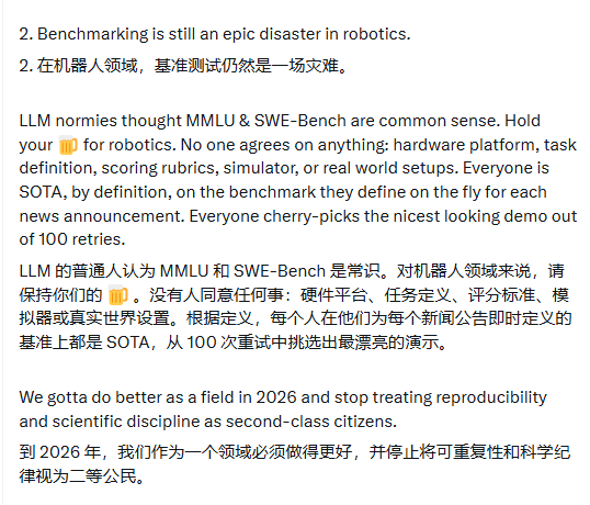 Jim Fan呼吁:"2026年我们必须做得更好,停止将可复现性和科学纪律视为二等公民。"这一批评直指行业缺乏科学严谨性的根本问题。