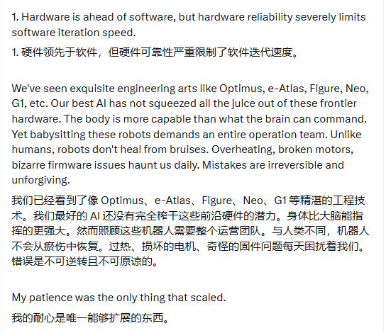 Jim Fan指出,尽管Optimus、e-Atlas、Figure、Neo、G1等机器人展现了精湛的工程技术,但硬件可靠性严重限制了软件开发速度。他表示,当前最先进的人工智能尚未充分发挥这些前沿硬件的全部能力,"身体的能力超过了大脑的指挥能力"。
