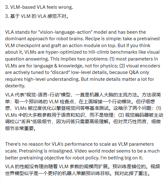 Jim Fan认为,VLM是为视觉问答等基准测试高度优化的,其预训练目标与机器人需求存在错位,"没有理由相信VLA的性能会随着VLM参数的增加而扩展"。他表示正押注于视频世界模型作为更适合机器人策略的预训练目标。