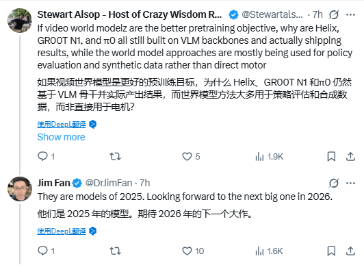 Jim Fan回应称,这些是2025年的模型,期待2026年的下一代大模型。