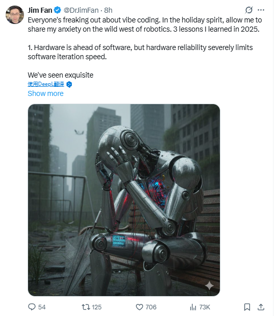 近日,英伟达机器人业务负责人、GEAR实验室联合负责人Jim Fan在社交媒体上发表长文,对机器人行业现状提出严厉批评。他认为,尽管硬件技术取得显著进展,但整个行业在软件迭代、标准制定和技术路线选择上仍处于混乱状态。