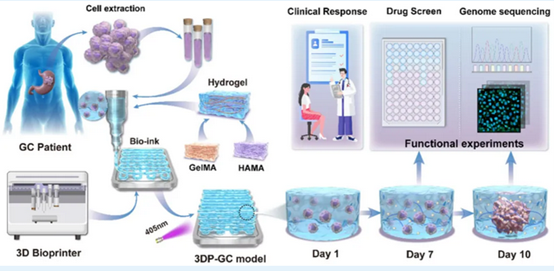 3D生物打印胃癌模型制备流程及其在患者临床药物反应预测中的应用示意图